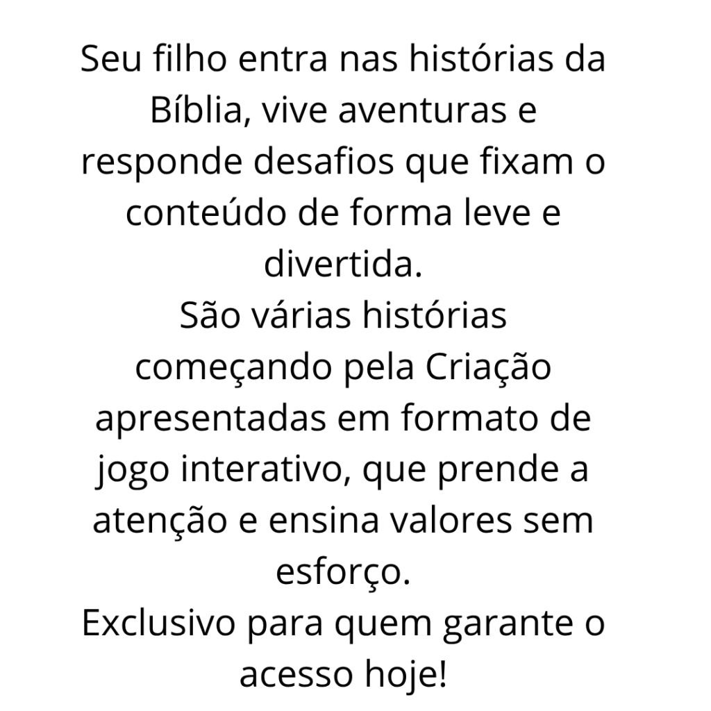 Você terá acesso a um material exclusivos feito por professores Cristãos! São mais de20 Jogos Bíblicos prontos para imprimir e utilizar com as crianças a partir dos 3 anos.